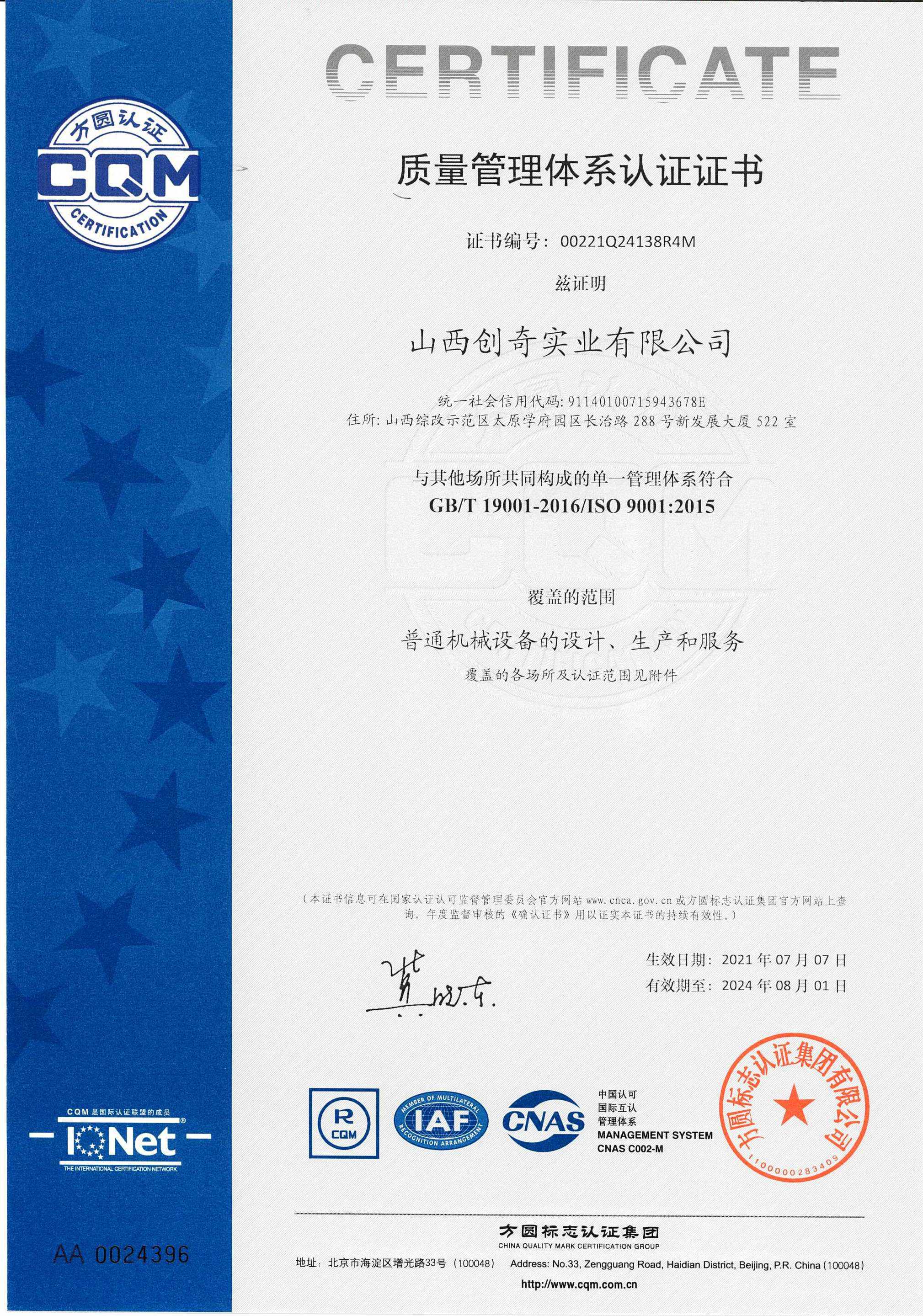 质量管理体系认证证书